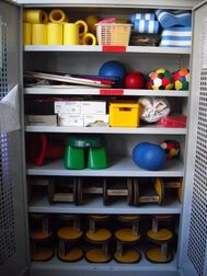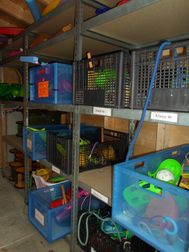 Eigenverantwortlich werden am Ende der Pause die Kisten wieder zurück zum Häuschen gebracht. Dort warten Kinder der älteren Klassen und helfen beim Sortieren. Der Inhalt wird zu Beginn jedes Schuljahres geprüft und ggf. aufgefüllt.